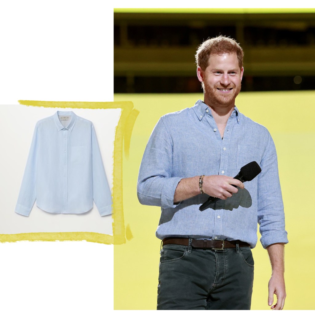 We spotted the last casual trend on Prince Harry, for Duke of Sussex speaks onstage during Global Citizen VAX LIVE the outfit was a simple linen slim suit shirt and comfortable jeans.