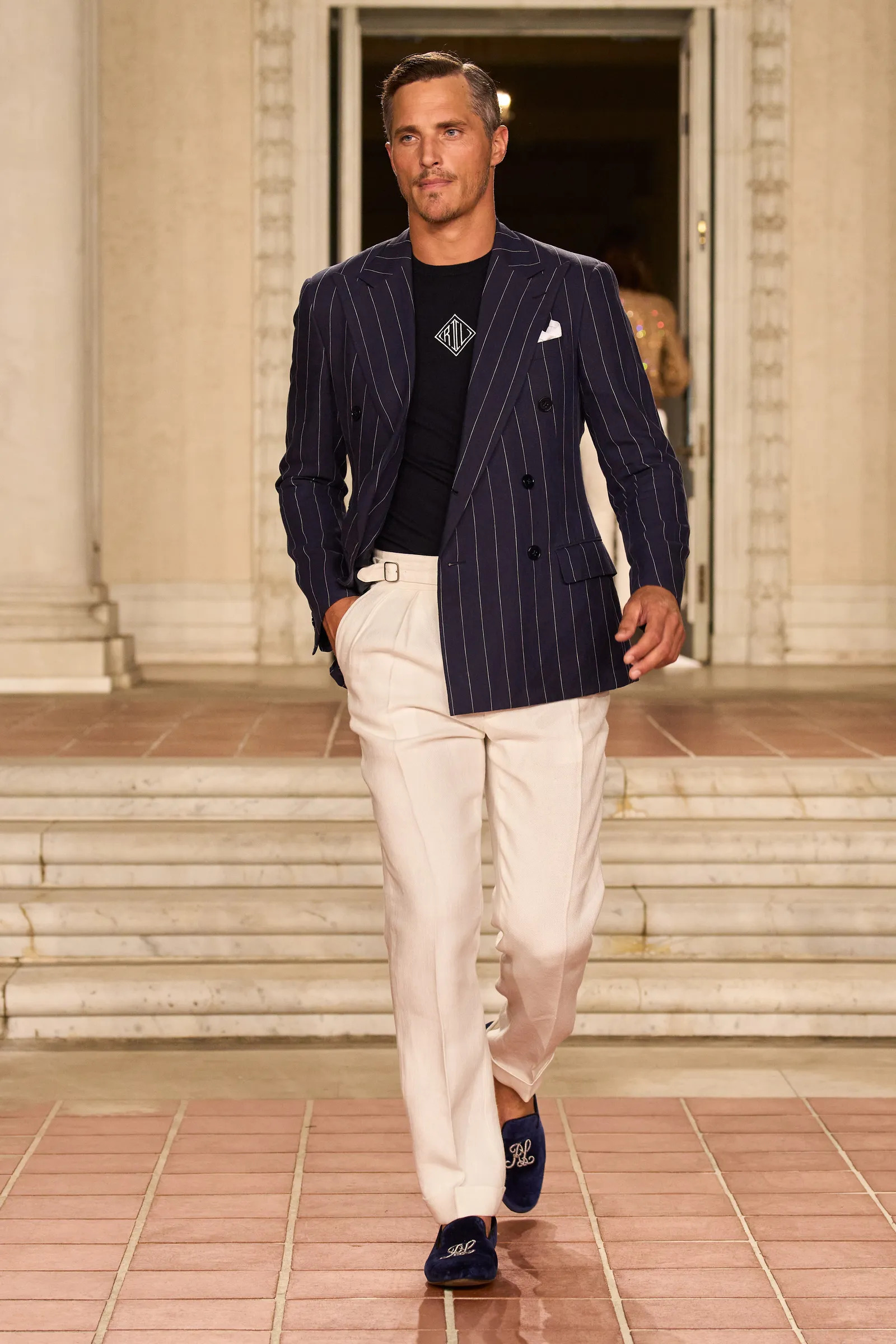 It was against the museum’s Mediterranean Revival style facade that Lauren presented his vision to his pals from the upper echelons of Hollywood’s elite—Jennifer Lopez and Ben Affleck, Diane Keaton (whom he dressed in her breakthrough role in Annie Hall), Laura Dern, John Legend, Chris Pine, Lily Collins, and Robin Wright, to name but a few. He savvily had a strong contingent of content creators present too, like TikTok stars Noah Beck and Wisdom Kaye. The cushioned loungers and twilight cocktail hour set the tone—this was California casual, done the Ralph way.