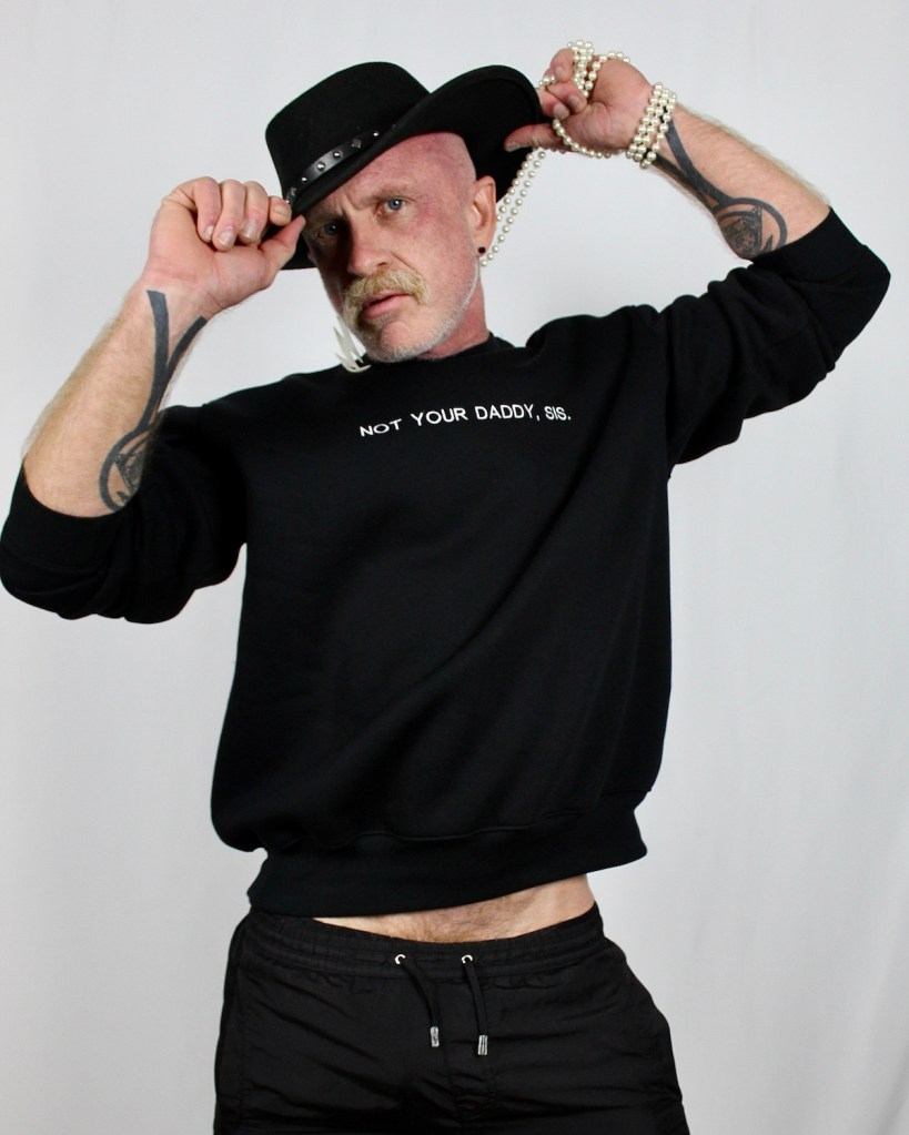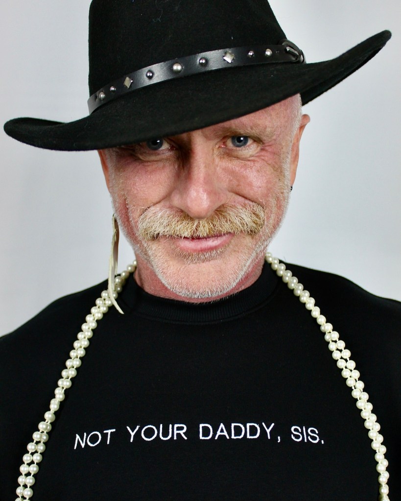 “I love myself. I love to perform. I love to tell stories. As I’ve aged, my stories have become richer and I love myself a little better every year. So I’ve naturally embraced becoming a Daddy. But it’s complicated—I’m a daddy with a story to tell. I’m a hard working farmer and rancher daddy, a cowboy at heart who enjoys the spotlight. I’m a fancy Daddy. I’m my own creation of boots, Stetsons, jewelry, and fashion.