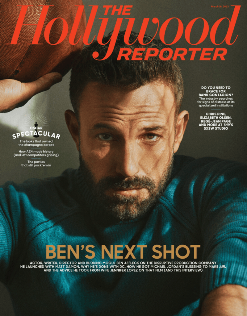 Ben Affleck’s next shot. In THR’s latest cover feature, the actor, filmmaker and budding CEO on the disruptive production company he launched with Matt Damon, why he’s done with DC, getting Michael Jordan’s blessing for #AirMovie and the advice he took from wife Jennifer Lopez.