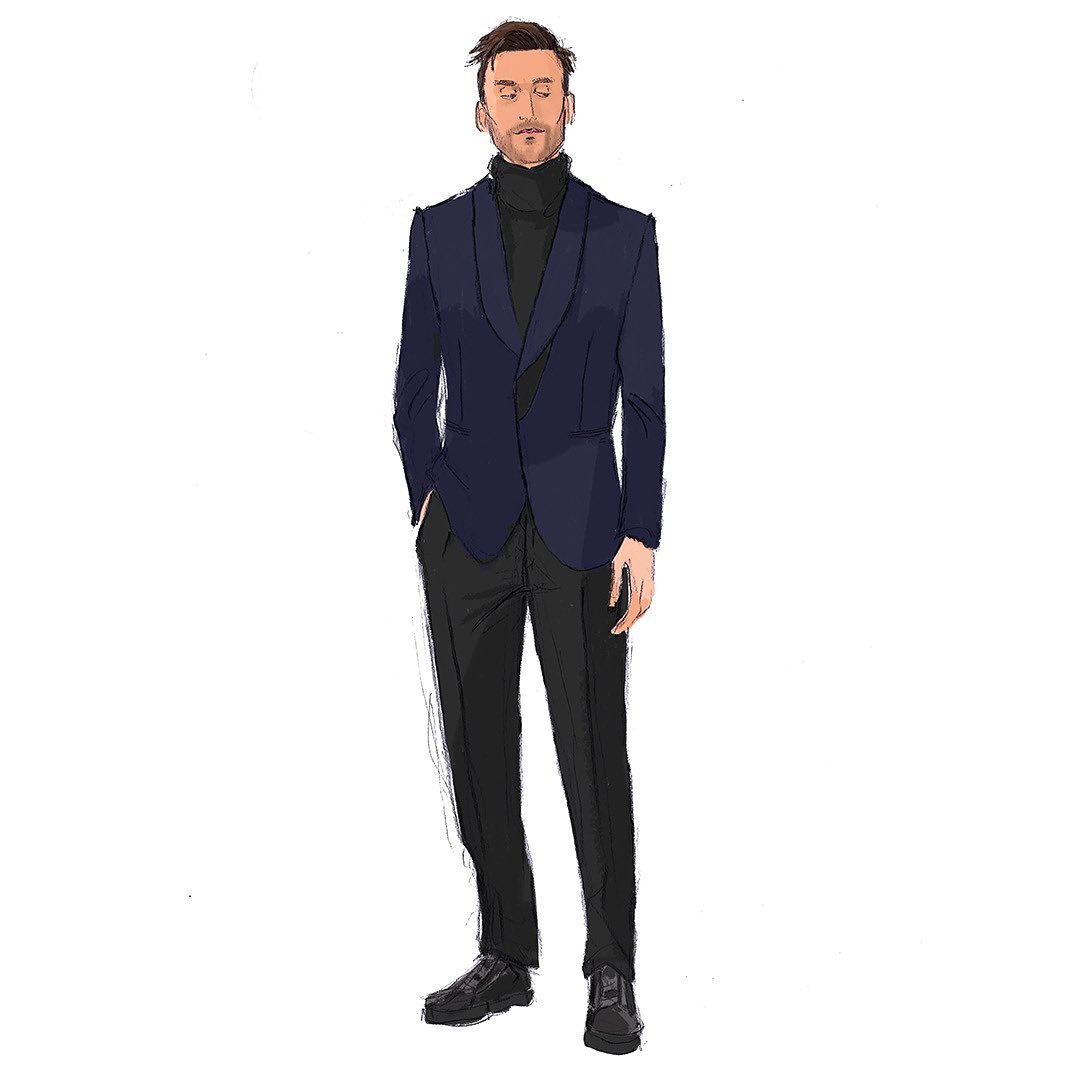 The Emmy and SAG Award-nominated actor wears the iconic Triple Stitch™ in black velvet with a ZEGNA made-to-measure shawl lapel jacket with satin details, black wool trousers and Oasi cashmere turtleneck.